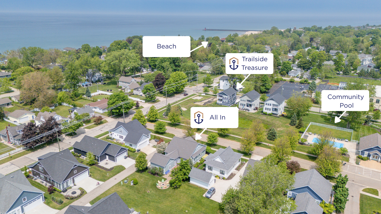 Trailside Treasure and All In are located in the Trailside neighborhood, named because of its location next to the Van Buren hiking and biking trail. These homes have access to a community pool. Twilight Ridge is a few blocks away from Trailside and is a quaint ranch home with a large backyard deck. Both properties are near the Blue Stairs beach access, Kid's Corner Park, and a little over a mile from downtown South Haven. They are 0.4 mile apart. Sleeps up to 42 people across the 3 homes.