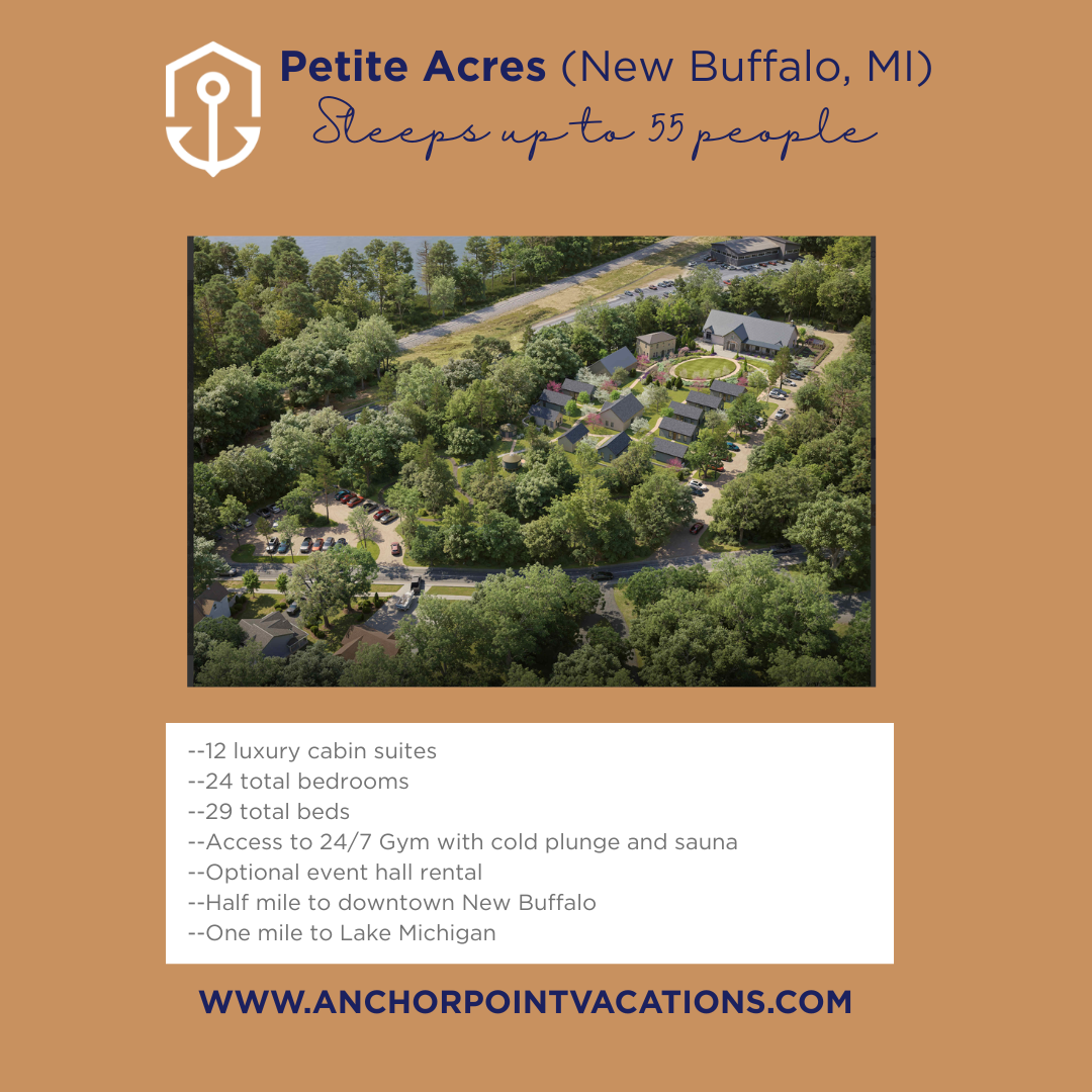 Perfect for large gatherings, this private estate of luxury cabin suites is exclusively yours to enjoy. With 12 suites and 29 beds accommodating up to 55 guests, it’s ideal for reunions, retreats, or celebrations. The on-site wellness center features gym equipment, a sauna, and a cold plunge, while an optional event hall provides an elegant setting for dinners or special occasions. Perched on 4.24 elevated, tree-lined acres, and all just 0.5 miles from downtown New Buffalo and 1 mile from Lake Michigan’s sandy shores.