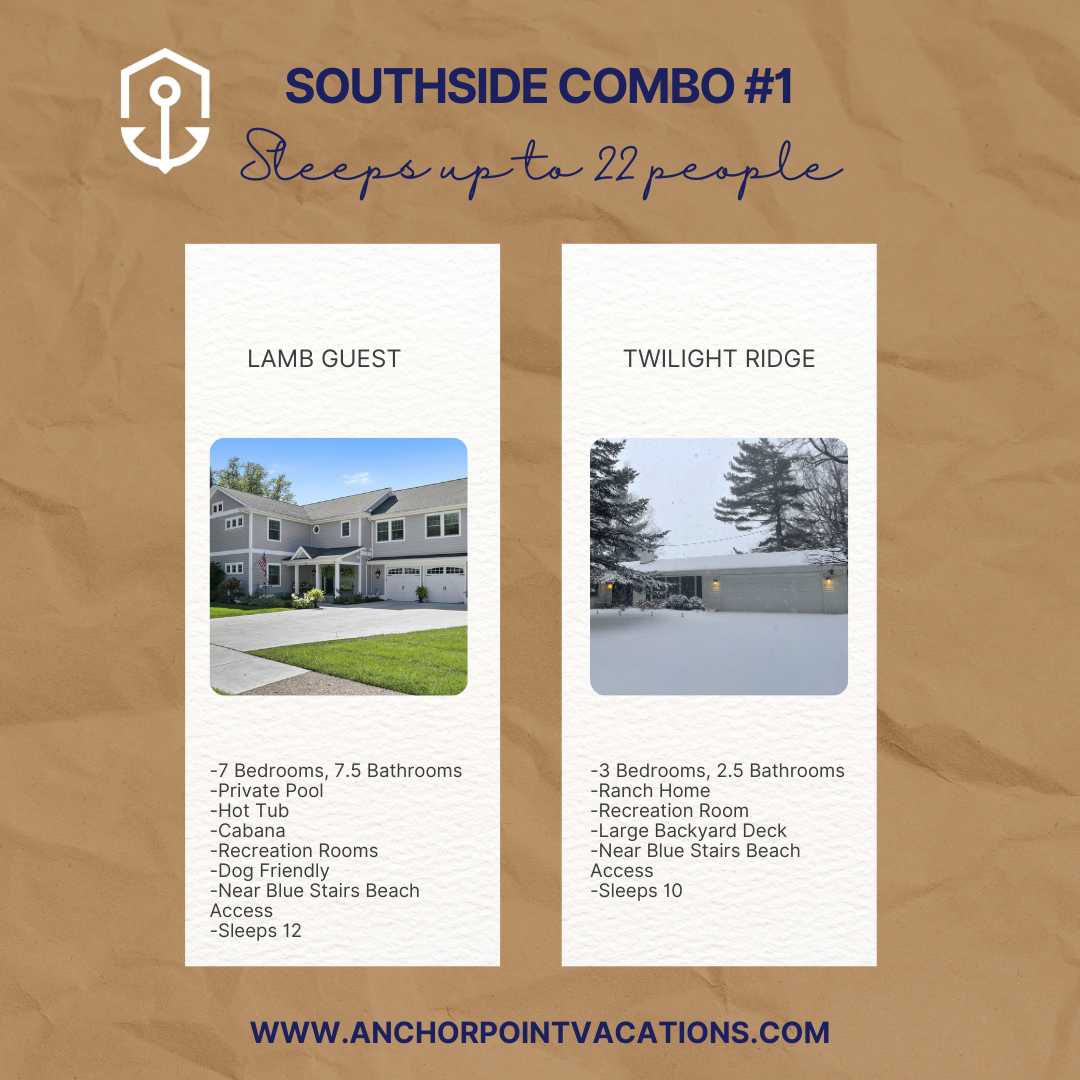 Lamb Guest is a 3-story home with resort-like amenities including a private pool, cabana, hot tub, firepit, outdoor chess and indoor recreation rooms. Twilight Ridge is a ranch home around the corner where guests can utilize 3 bedrooms on the main floor or additional sleeping space in the basement recreation room. Both properties are near the Blue Stairs beach access, Kid's Corner Park, and a little over a mile from downtown South Haven. They are 0.1 mile apart.