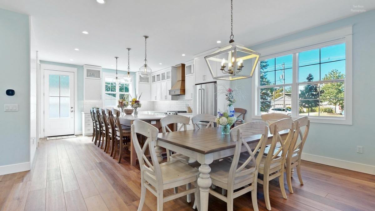 Light fixtures: The pendant lights are Pottery Barn Flynn Recycled Glass Pendant. The light above the table is Golden Lighting Haiden Light pendant in burnished chestnut.