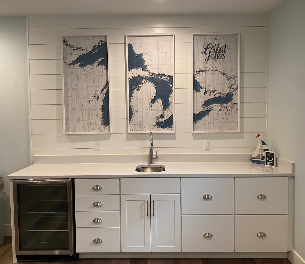 To curate the lakeside atmosphere, we went to a shop downtown called Shooting Star and we filled the kitchen glass cabinets with South Haven specific decor. We also displayed a nice Great Lakes map in the basement recreation room (pictured below).