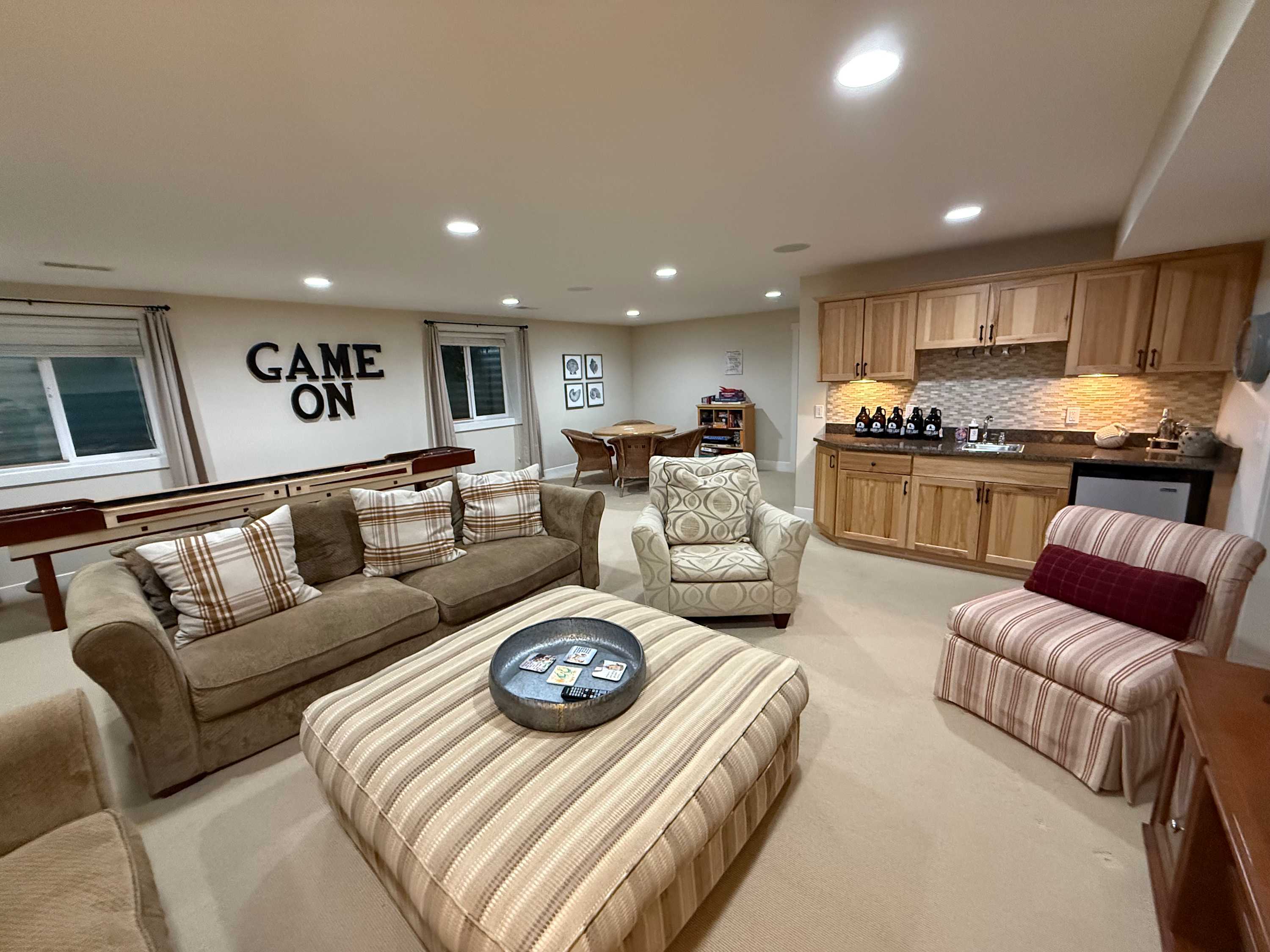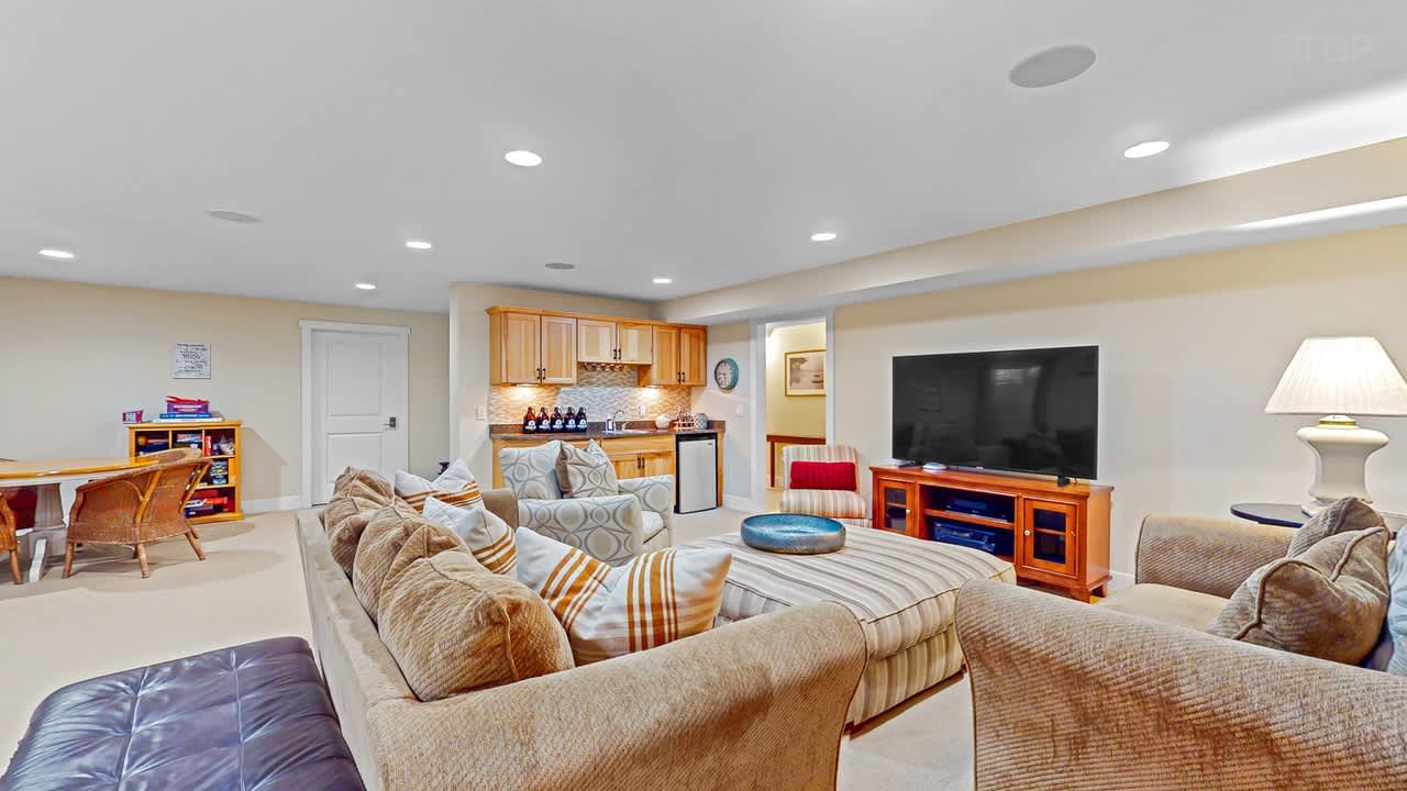 INDOOR LIVING: Luxury furnishings w/ beach décor, gourmet kitchen, fireplace, finished basement with wet bar, Smart TV, games