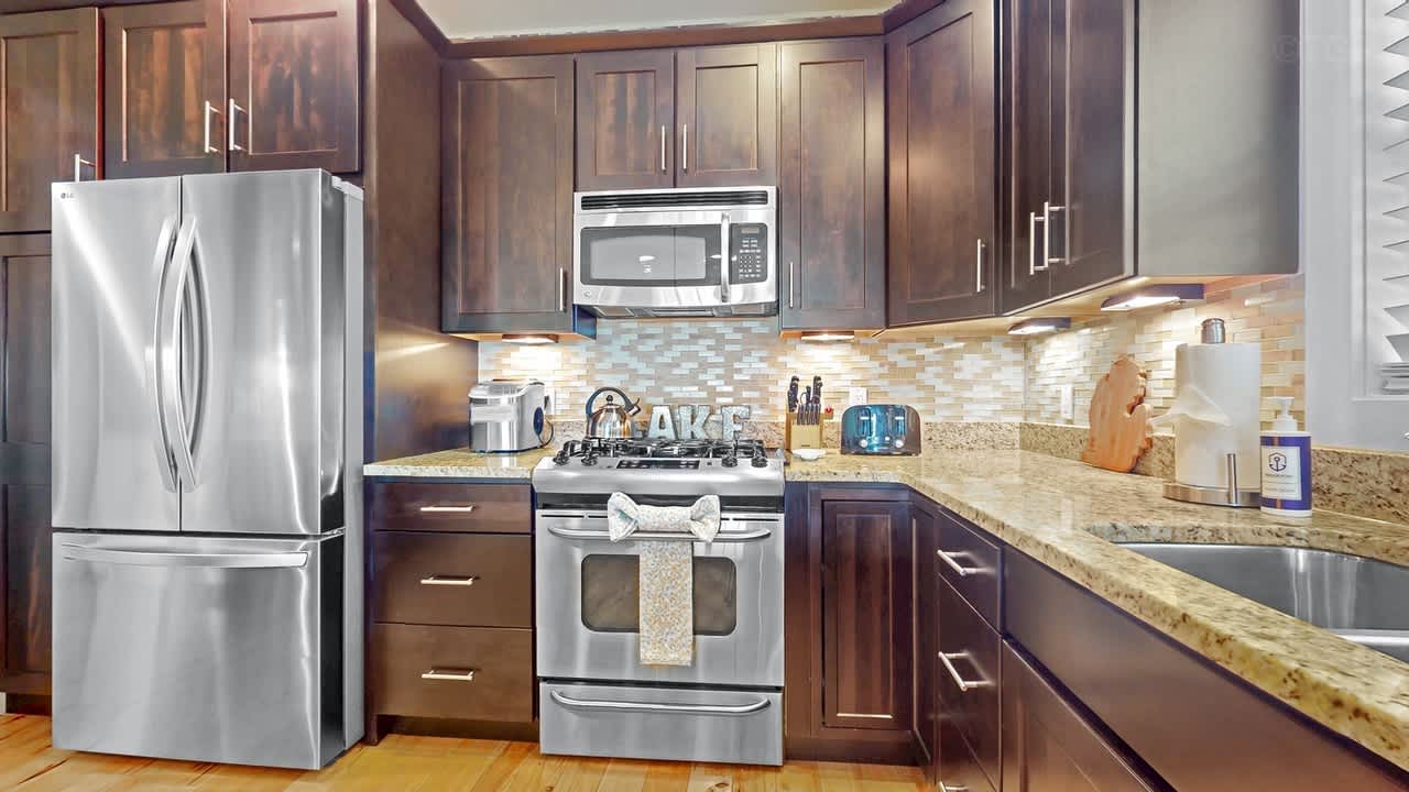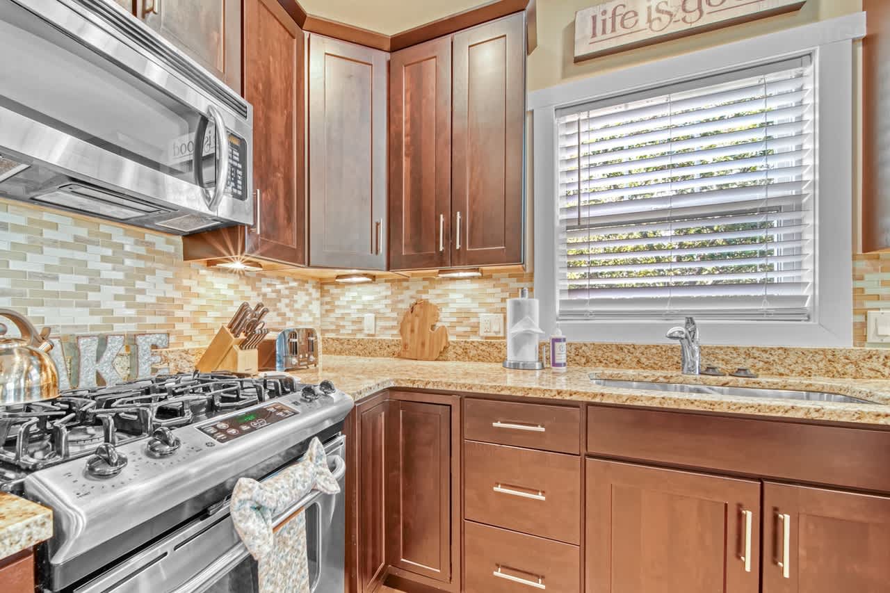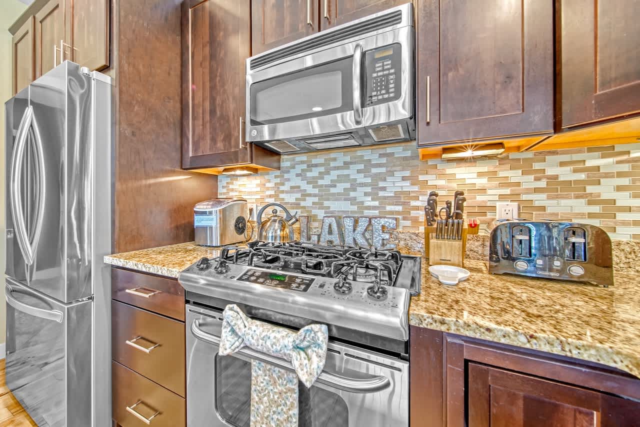 KITCHEN: Fully equipped with cookware, utensils, stainless steel appliances, gas range, coffee maker, and blender.