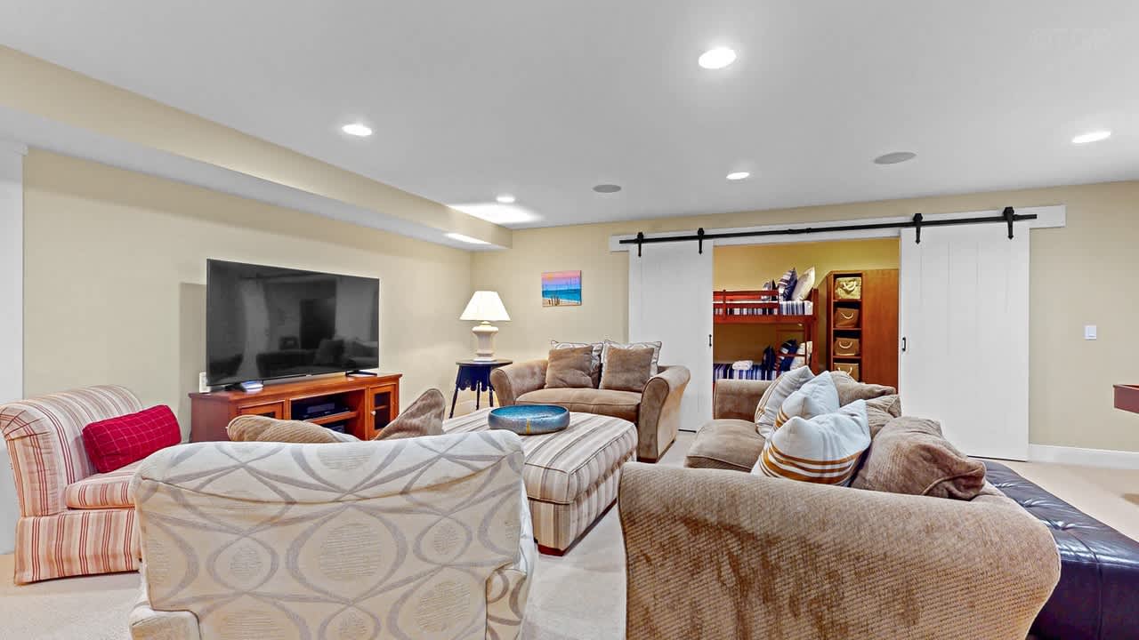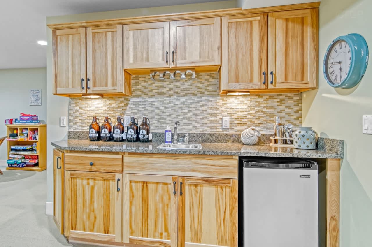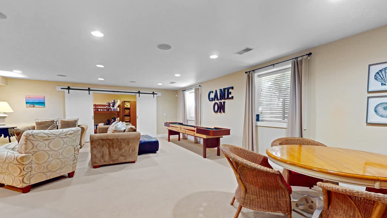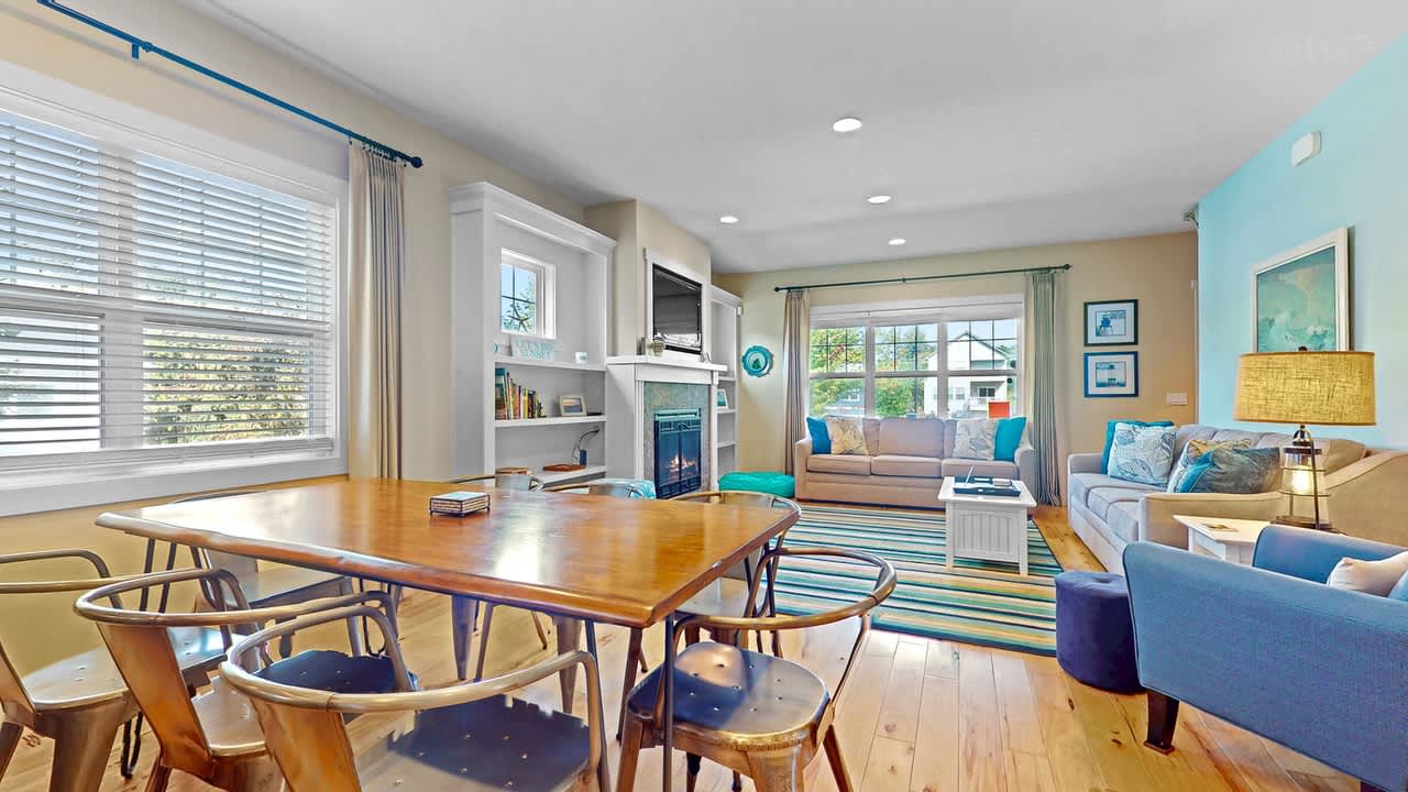 The finished lower level features a game room with shuffleboard, wet bar, and additional sleeping space, while the backyard invites gatherings around the fire pit, grilling, and yard games. Enjoy walkable access to Kids Corner Park and the Blue Stairs beach access at South Beach. Just a mile to downtown shops and dining!