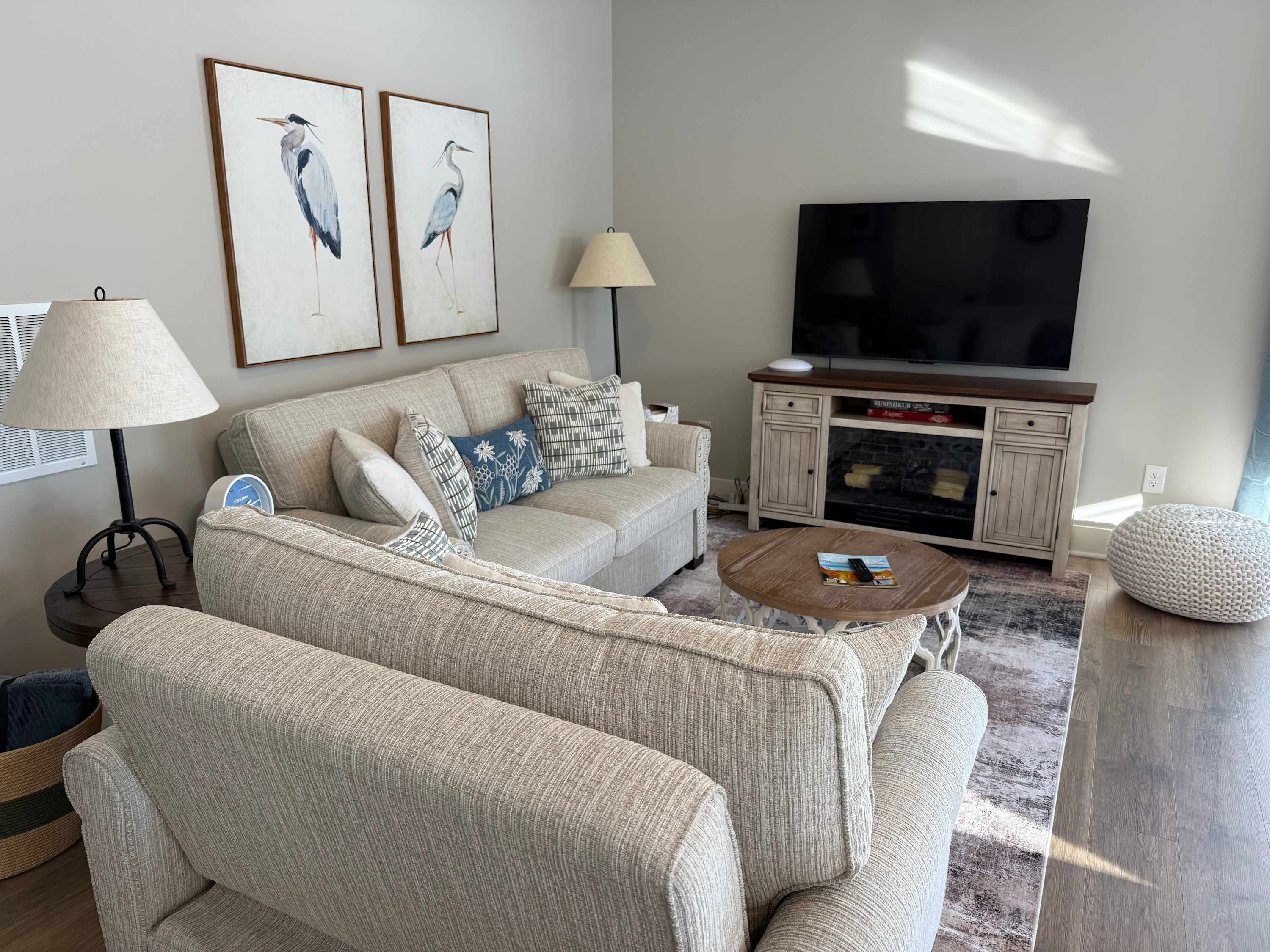 INDOOR LIVING: Furnishings w/ beach décor, stocked kitchen, Smart TV
