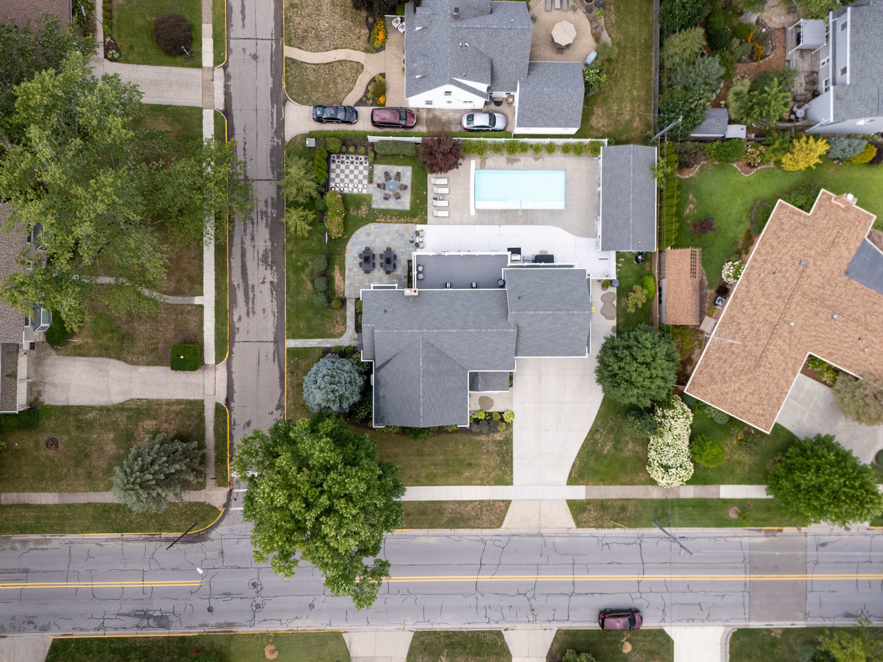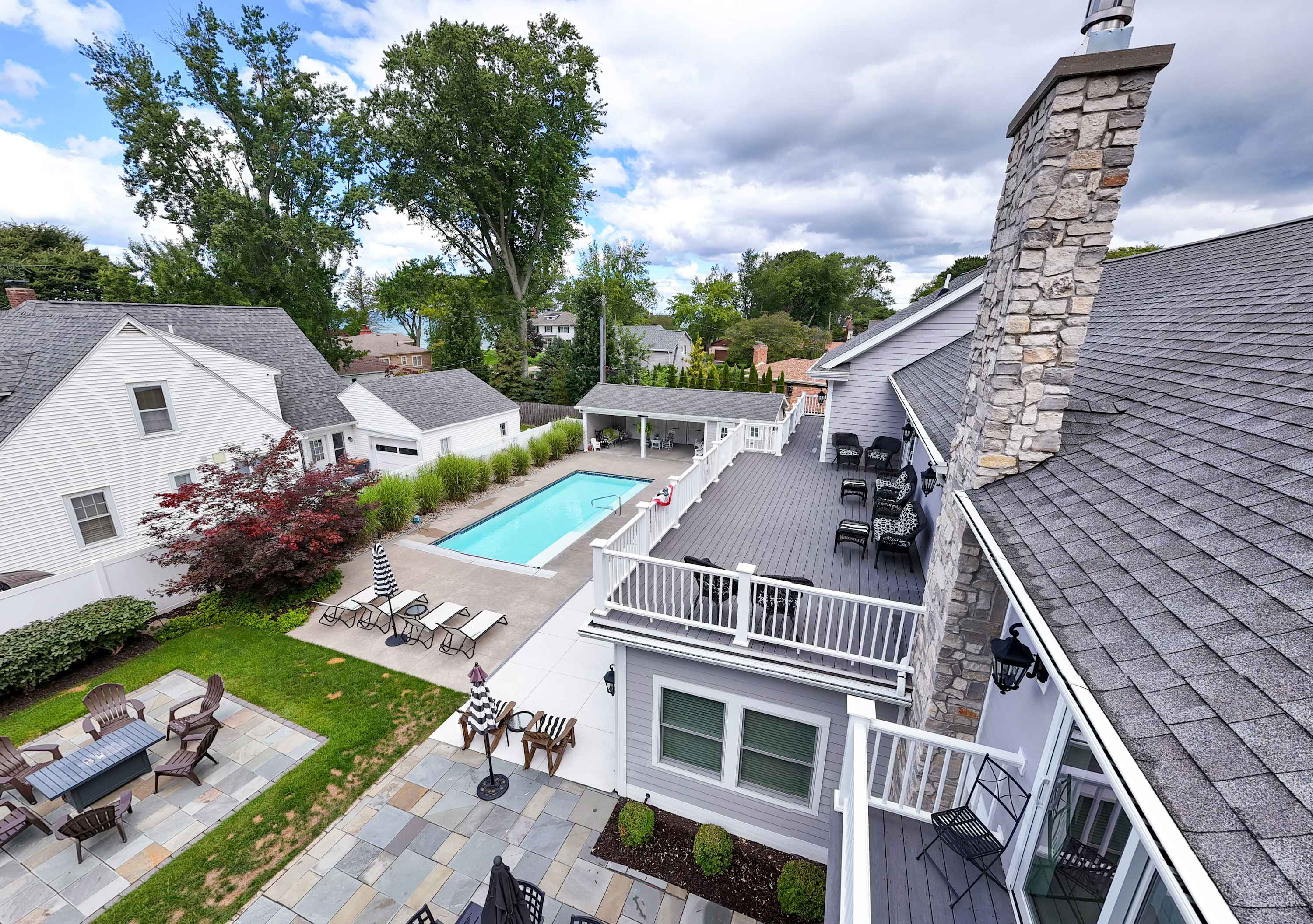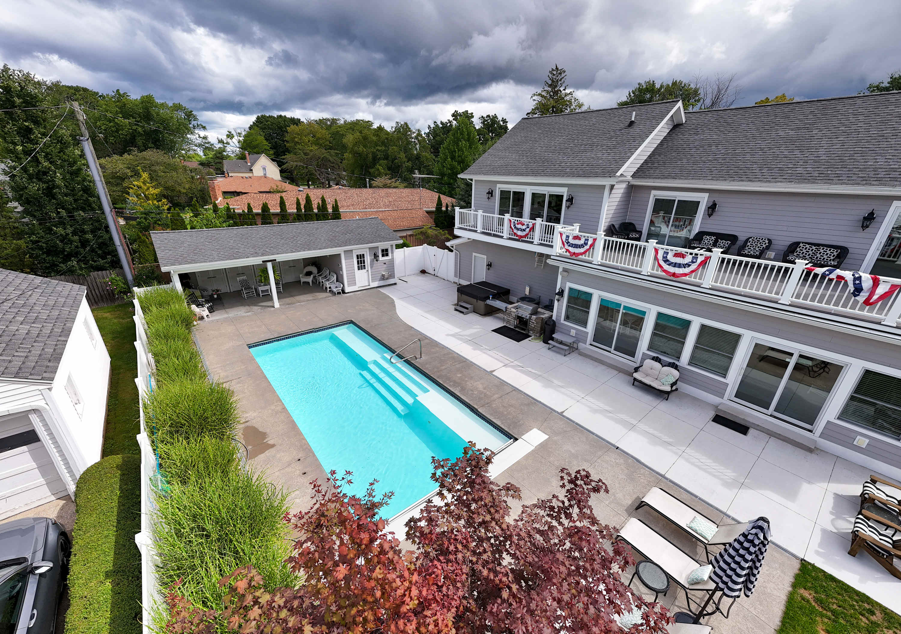 OUTDOOR LIVING: Pool and pool-house/cabana with half-bathroom, full fridge, and drinking fountain; Hot tub, al-fresco seating, gas grill; outdoor chess set, bicycles; second-story deck overlooking backyard