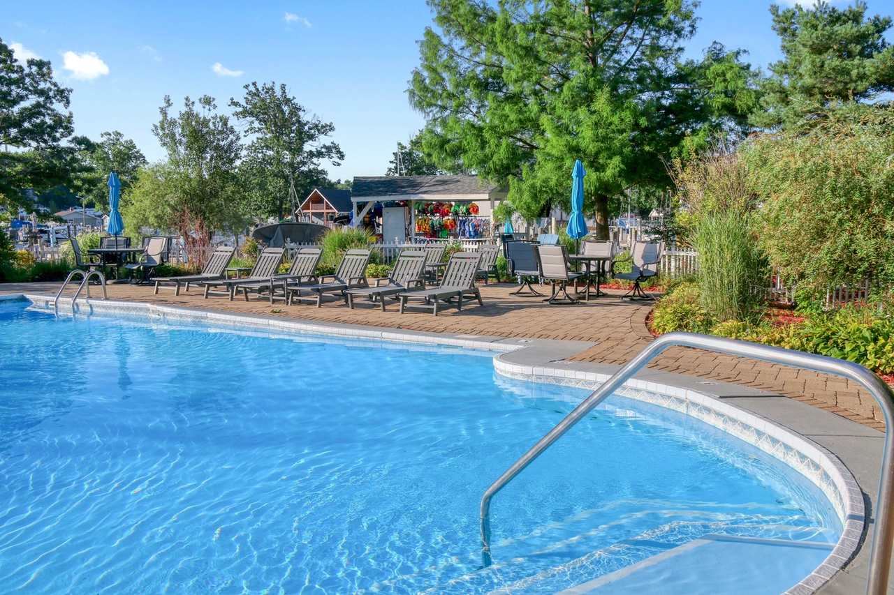 FAQ: The pool is heated with a retractable roof. It is open all year-round and accessible with a key fob located inside the home. A second outdoor pool is located at the marina and is open from Memorial Day to Labor Day.