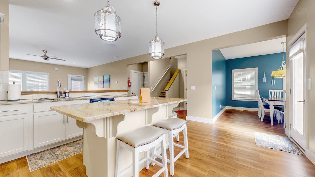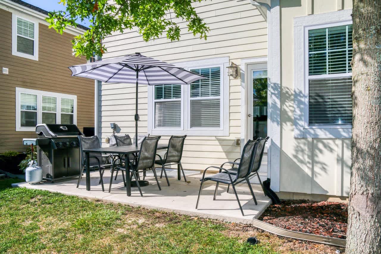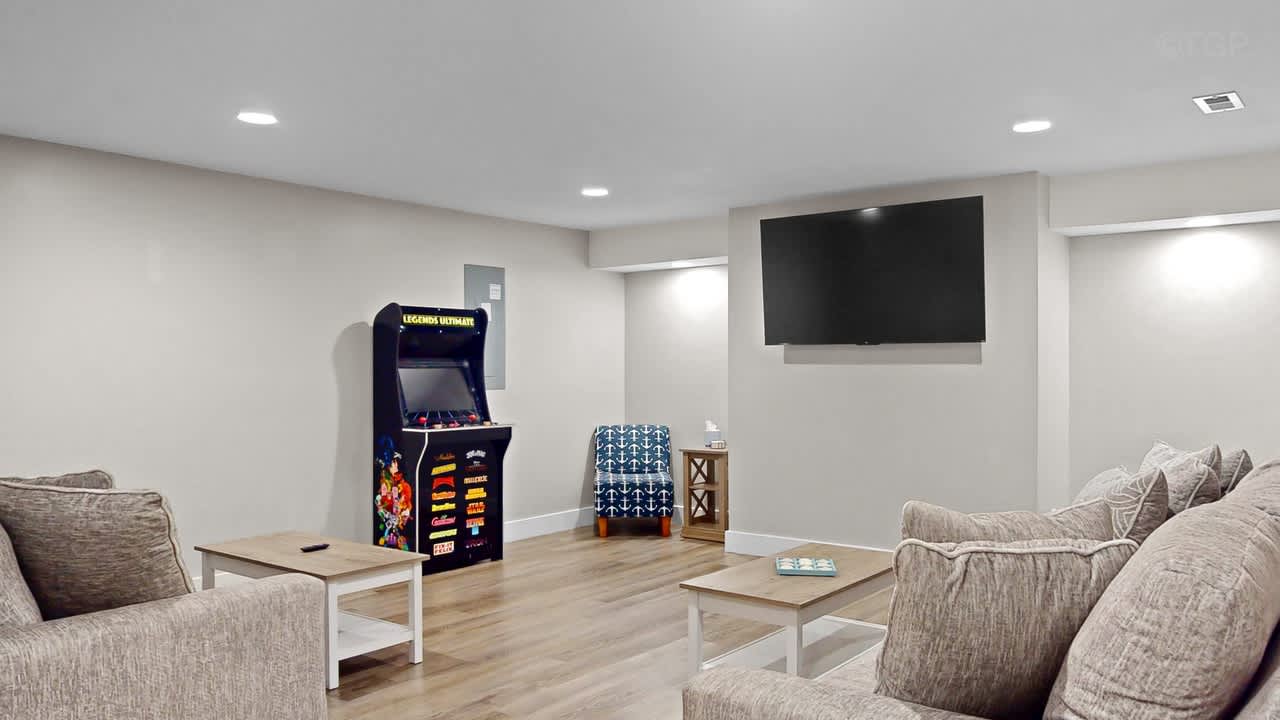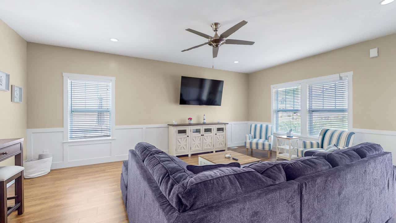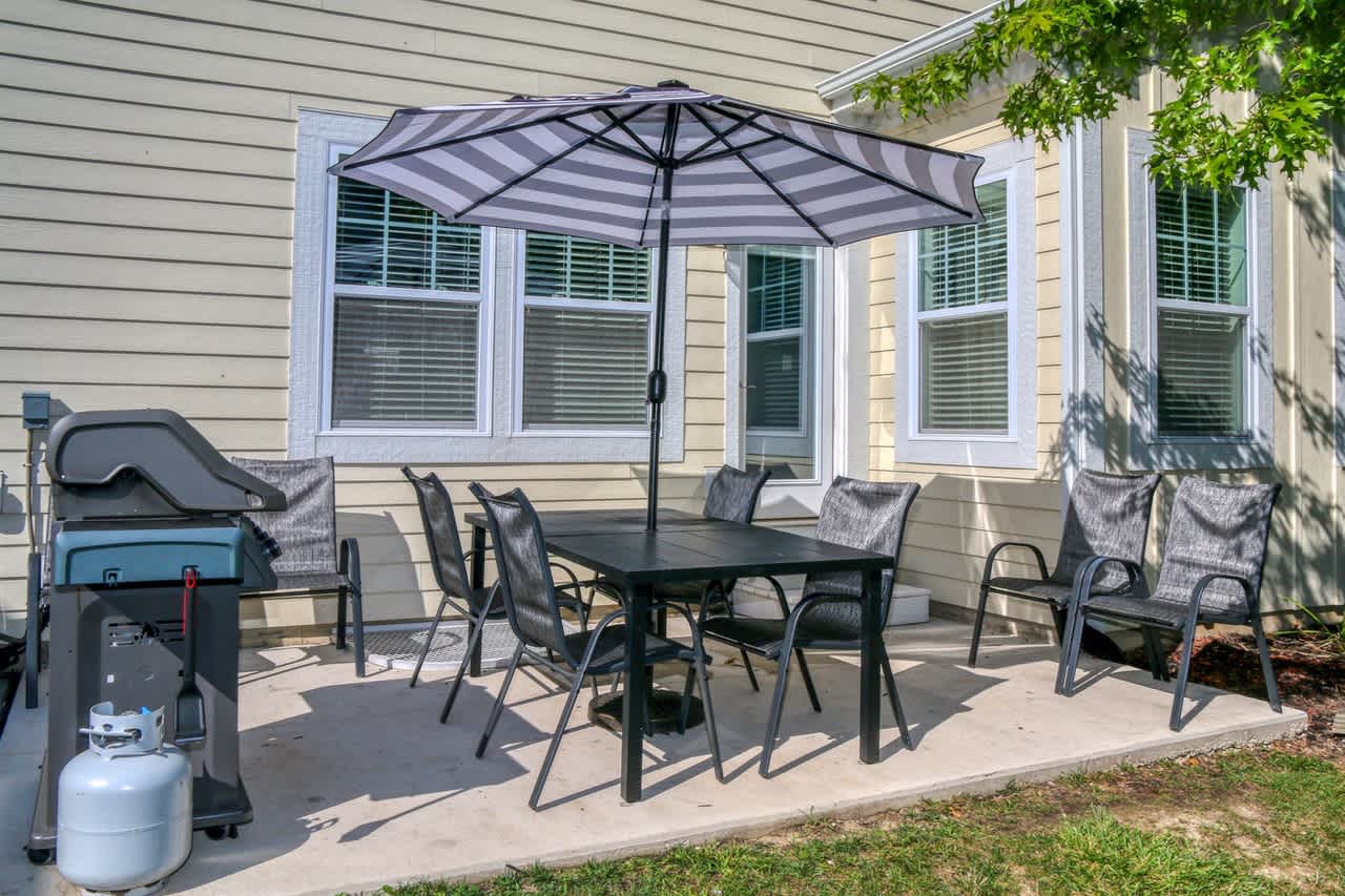 Prepare meals in the expansive, fully equipped kitchen and gather around the separate dining room for shared meals and memories. With five comfortable bedrooms and two inviting living areas, there’s ample space for everyone to relax and unwind. Step outside to the backyard patio to enjoy grilling or utilize the shared fire pit.