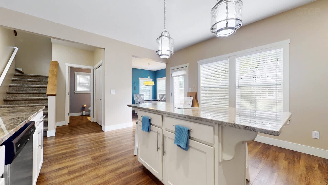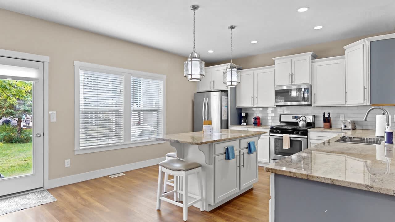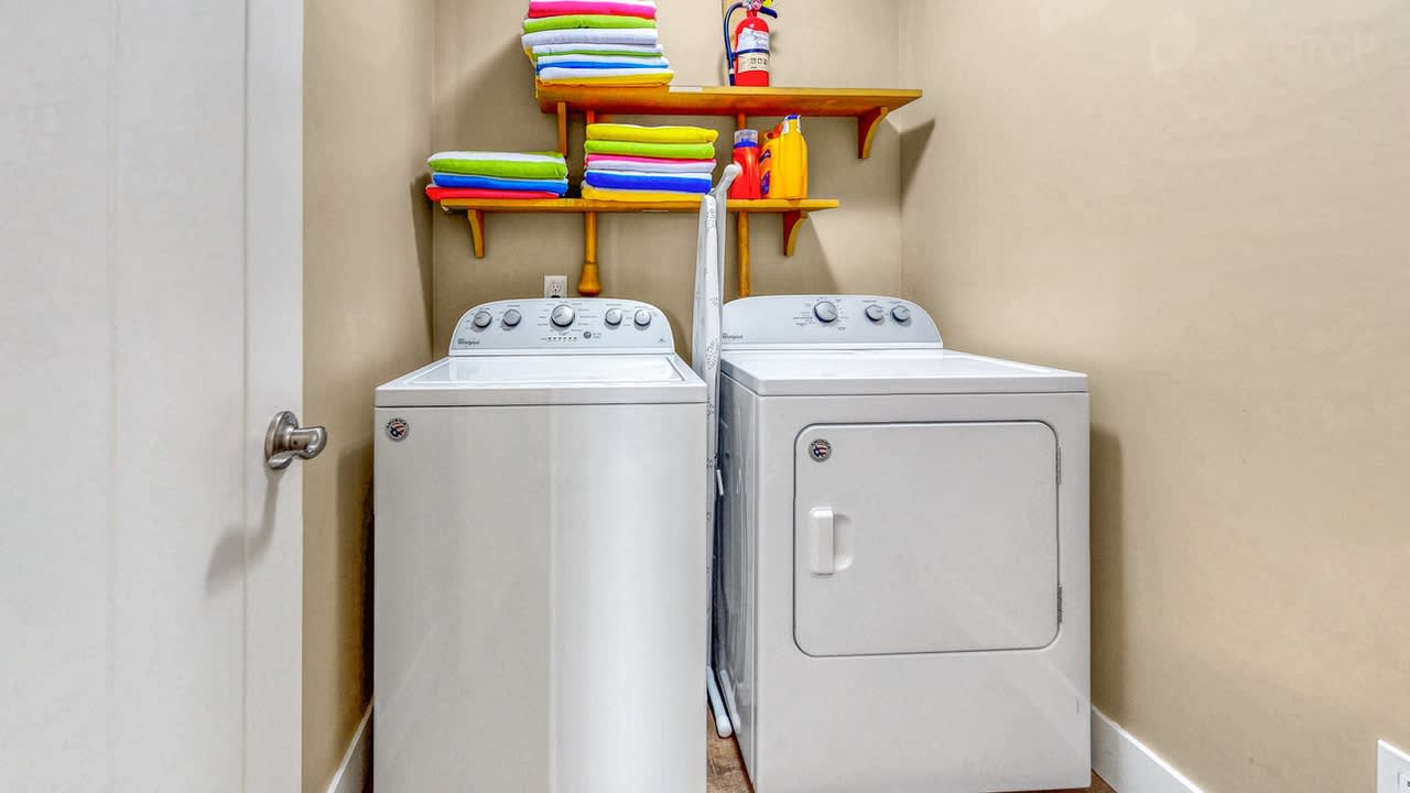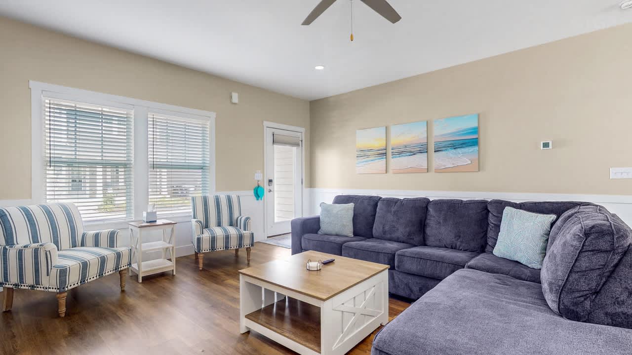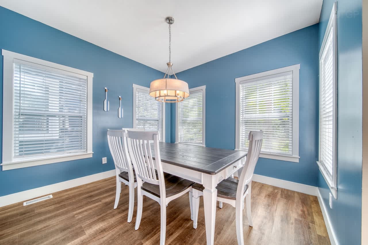 Prepare meals in the expansive, fully equipped kitchen and gather around the separate dining room for shared meals and memories. With five comfortable bedrooms and two inviting living areas, there’s ample space for everyone to relax and unwind. Step outside to the backyard patio to enjoy grilling or utilize the shared fire pit.