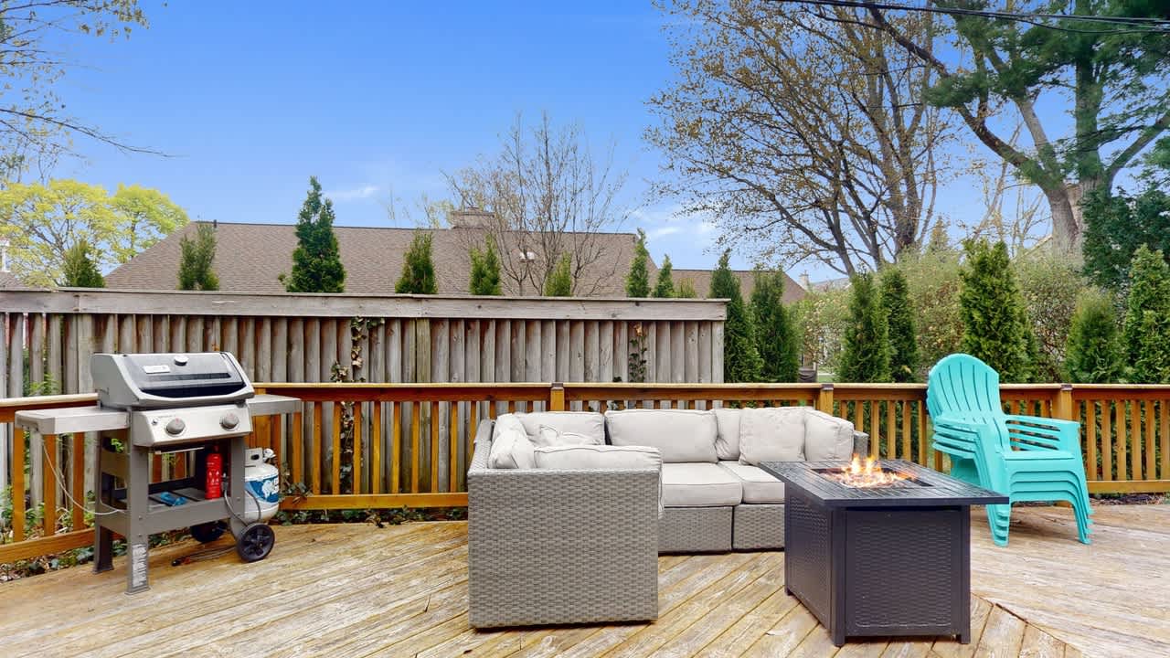OUTDOOR LIVING: Large deck, dining table, gas grill