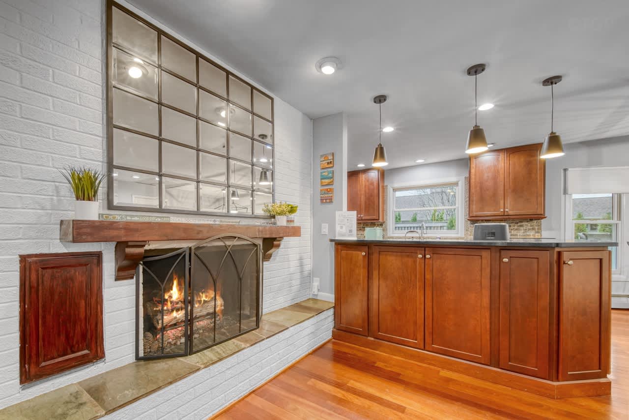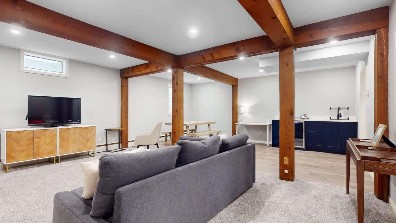 INDOOR LIVING: Stylish furnishings, gourmet kitchen, rustic fireplace, finished basement with wet bar and work desk, Smart TV